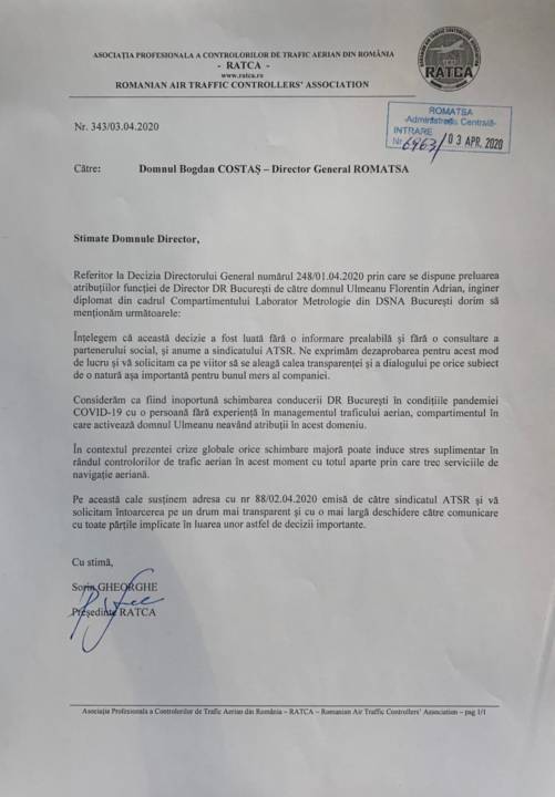 Directorul general al ROMATSA, Bogdan Costaș, cel care a luat decizia schimbării directorului DR București, a primit din partea sindicatului controlorilor de trafic solicitarea de a se întoarce „pe un drum mai transparent” și de a avea o mai mare deschidere în comunicare.