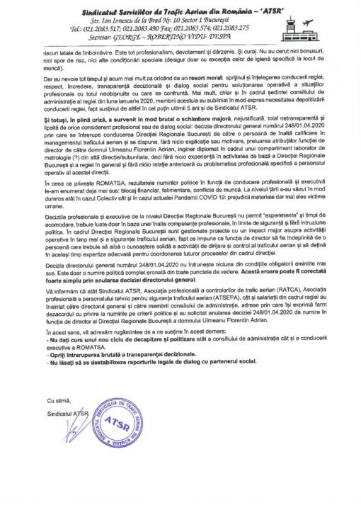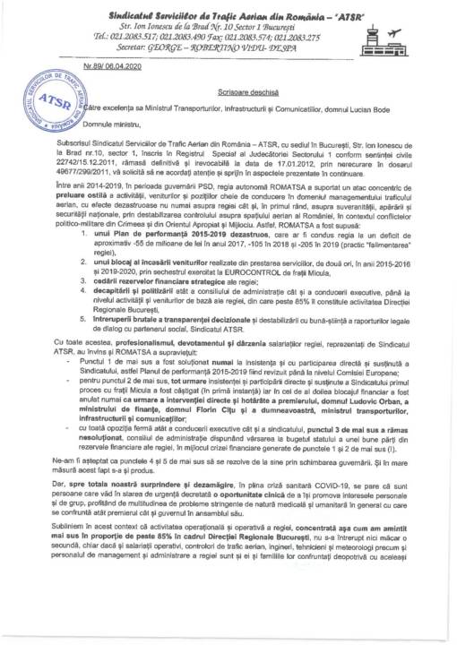 Sindicatul Serviciilor de Trafic Aerian „ATSR” a transmis ministrului Transporturilor, Lucian Bode o scrisoare deschisă prin care i se cere să nu dea curs unui nou ciclu de decapitare și politizare a conducerii executive a ROMATSA.