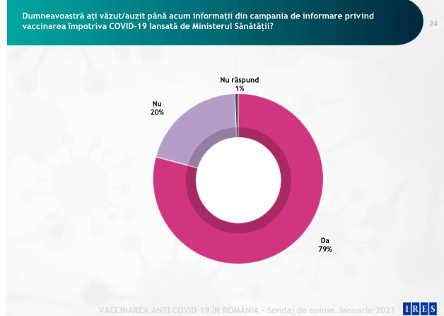 Un nou sondaj realizat de IRES (Institutul Român pentru Evaluare și Strategie) dezvăluie care este percepția românilor cu privire la vaccinarea împotriva virusului SARS-CoV-2. Potrivit sondajului, procentul românilor care spun că se vor vaccina împotriva COVID-19 este în creștere față de măsurătorile anterioare, tendința fiind explicabilă prin dezbaterilor intense din spațiul public cu privire la acest subiect. Chestionarul s-a realizat în perioada 13-15 ianuarie 2021, fiind intervievați 1.512 de oameni cu vârsta de 18 ani și peste.